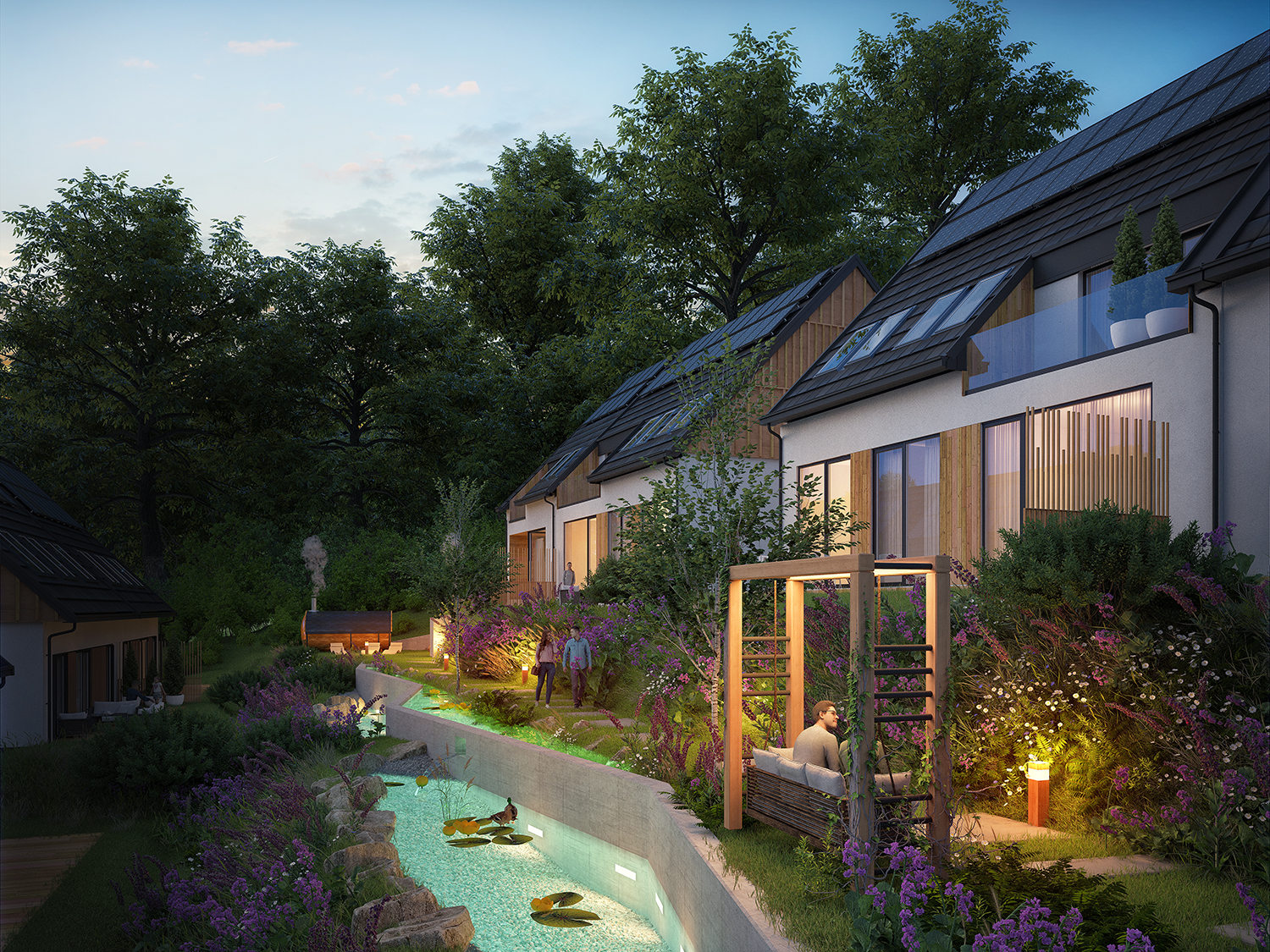 - Infrastrukturę kompleksu, obejmującą miejsca postojowe, ciągi komunikacyjne oraz elementy rekreacyjne, takie jak place zabaw, wiata grillowa, boisko sportowe, balia i sauna ogrodowa.